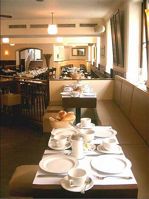 Bereiche hierbei sind: Cerealien und Mu?sli, Obstsalat, Fru?chte, Natur- und Fruchtjoghurt, sowie Quark und Milch. Eine Auswahl an Bro?tchen und Bauernbrot, dazu Butter und Kra?uterquark, sowie hausgemachten Marmeladen, Honig und Nutella. Wurst und Ka?se, verschiedene Salate und Antipasti. Das warme Fru?hstu?ck besteht aus: Ru?hrei, Speck, Grilltomaten und wechselnd aus Pancakes oder French-Toast mit Ahornsirup. Das Mittagessen, bilden vier verschiedene, warme Hauptgerichte – immer mit einer vegetarischen Variante. Dazu gibt es eine Dessertauswahl, sowie frische Fru?chte.